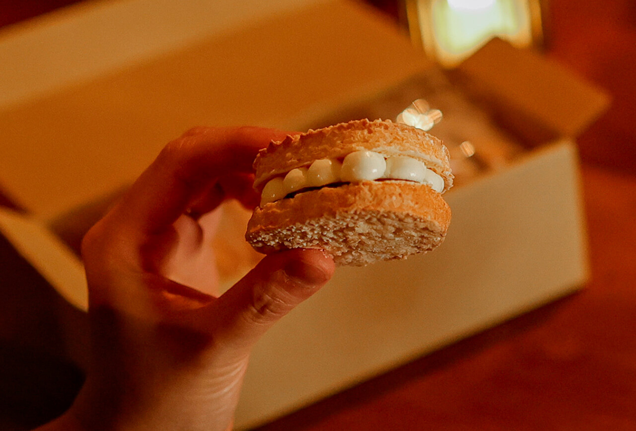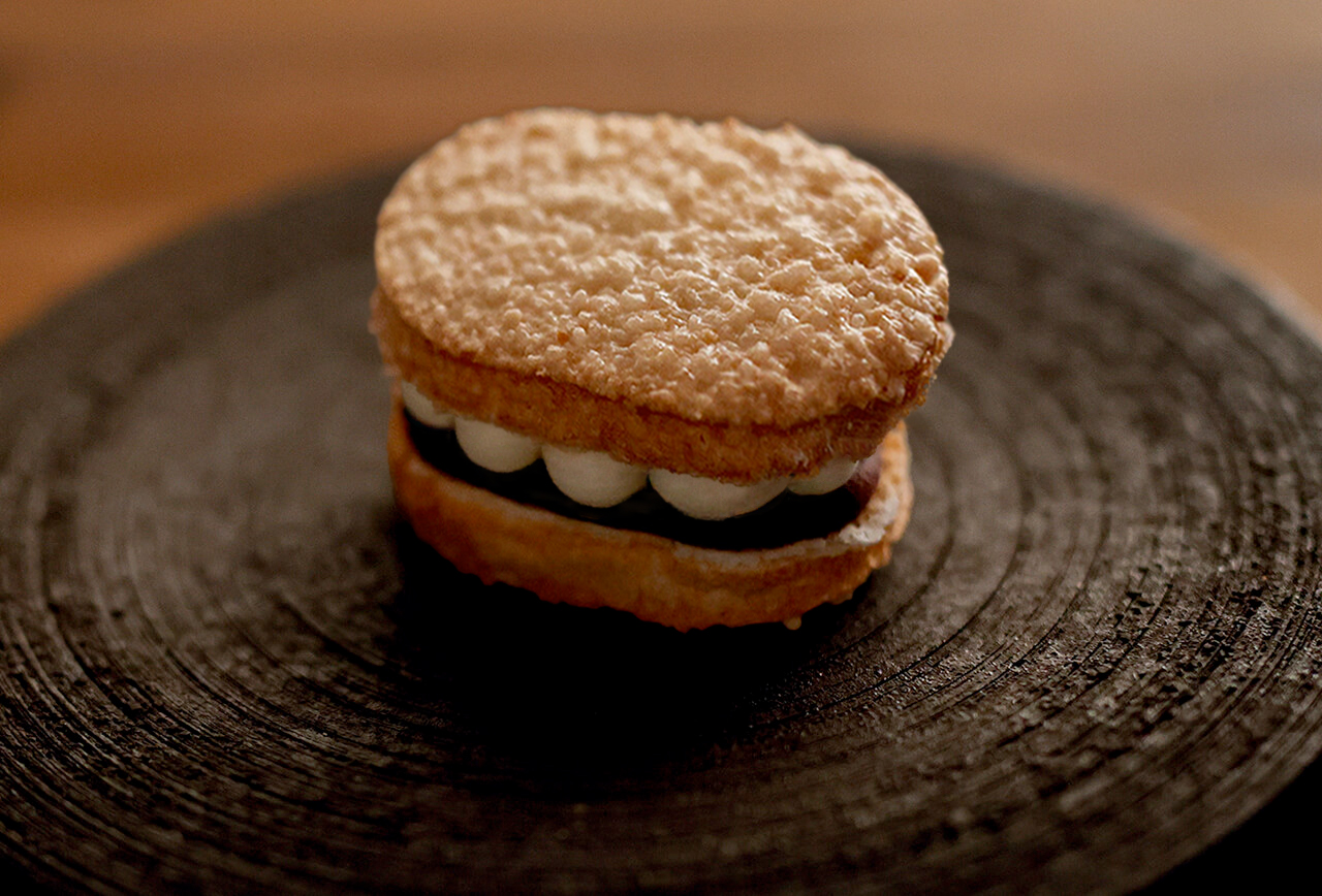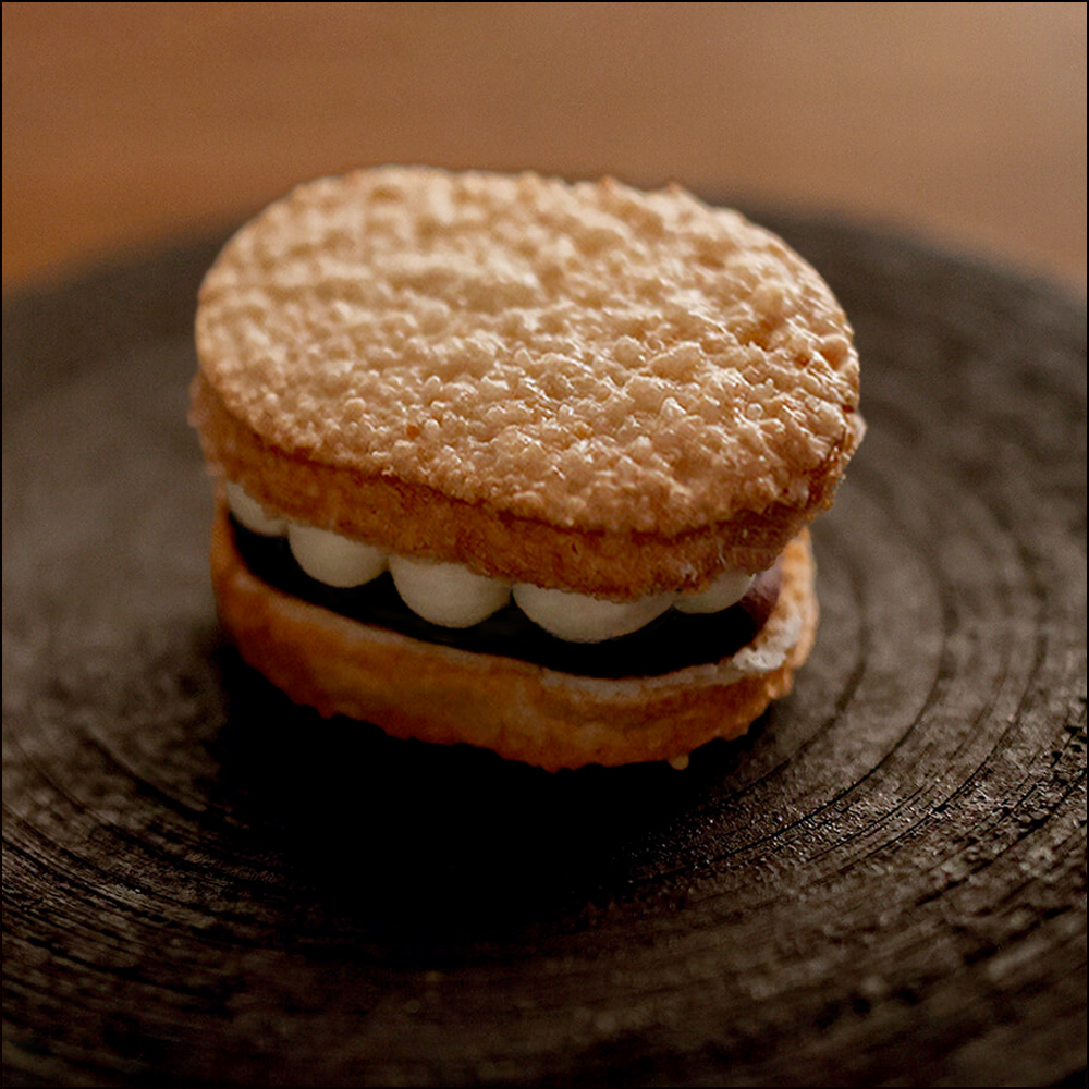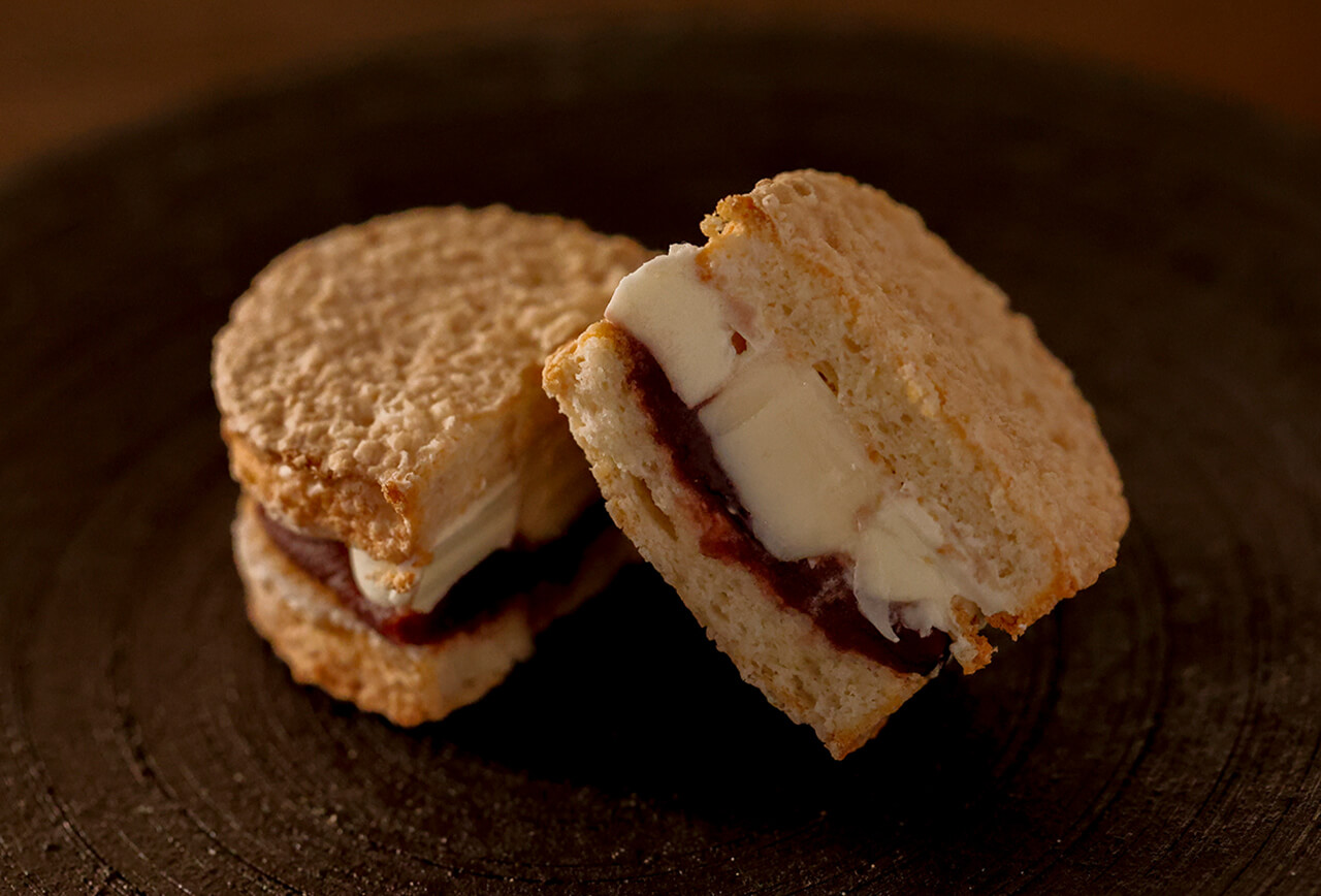 じっくり寝かせた九州産発酵バターと、糖度の低い北海道産こし餡を、モルトエキスとモルトパウダーを練り込んだダックワーズ生地でサンド。